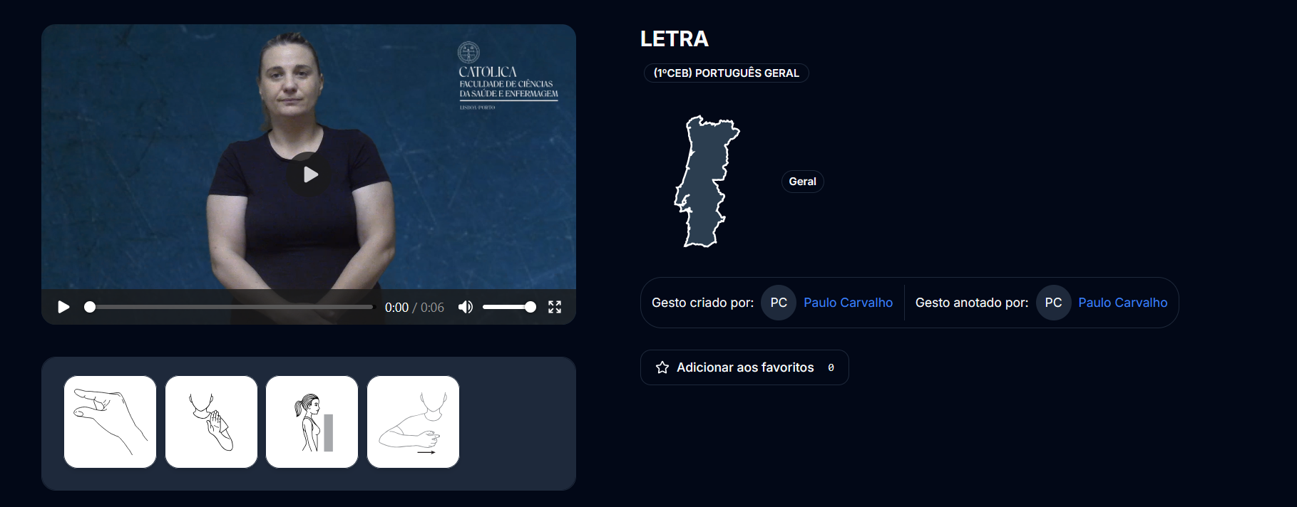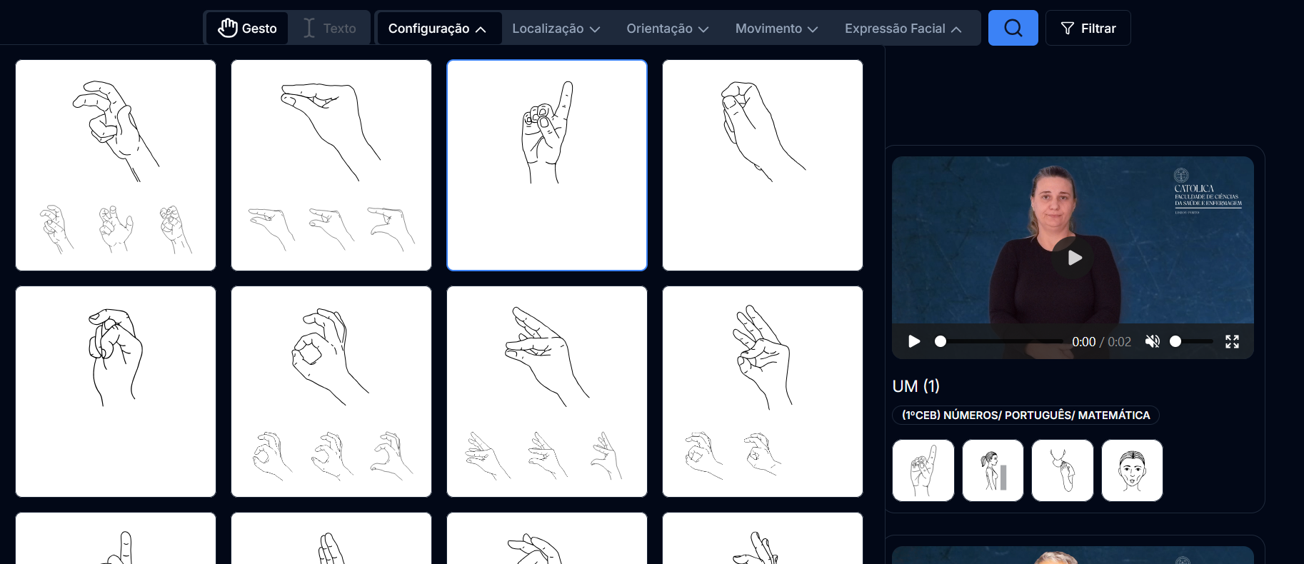 Com mais de duas mil entradas anotadas, este Dicionário tem um motor de pesquisa por Gesto unico, sendo possível pesquisar um gesto por texto ou pelas suas características: Configuração da mão, Localização, Orientação, Movimento e Expressão Facial.
